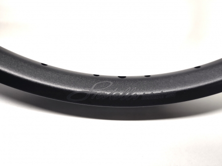 Alle Felgen von Fratelli in unserem Programm haben eine matte, glasperlengestrahlte Oberfläche und sind komplett innen wie aussen eloxiert. Der Stoß ist gesteckt und verklebt. Zusätzlich wird er mit einem bedruckten Band abgeklebt. Das Logo wir in die Flanken gelasert. Alle Felgen, die Fratelli speziell für uns fertigt, haben ein eloxiertes und sehr dezentes schwarzes Laserlogo, welches die Hochwertigkeit dieser Felgen noch unterstreicht.